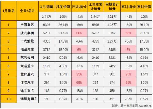 上表可见,1月份牵引车市场同比下降43%,同比增幅从上月(2022年12月牵引车市场同比增长2%)遭遇转负,较去年同期少销售约1.86万辆。具体到1月销量排行前十企业来看,十家企业4增6降,陕汽、福田、北奔和江淮四家企业实现增长,1月份销量同比分别增长了66%、6%、25%和69%,其中北奔已是连续三个月实现增长,福田和陕汽则是连续两个月实现增长;遭遇下滑的企业降幅均达到两位数,且6家企业同比降幅均超过牵引车市场整体43%的降幅,下滑最严重的企业1月份销量同比下降了67%。