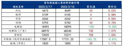 截止2023年2月10日,各原材料当日即时价格以及价格周环比情况如下: