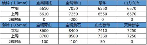 价格方面:中部市场镀锌宝钢青山1.0*1250*C报价7050元/吨,1.0*1250*C山力兴冶6570元/吨,1.0*1000*C宜昌国诚6610元/吨;彩涂方面,宝钢青山0.5*1000*C报价8600元/吨,0.5*1000*C宝钢黄石8400元/吨,0.5*1000*C山力板带7410元/吨,0.5*1000*C天津新宇7250元/吨。