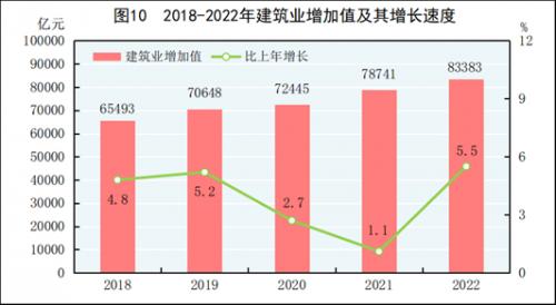 全年建筑业增加值83383亿元,比上年增长5.5%。全国具有资质等级的总承包和专业承包建筑业企业利润8369亿元,比上年下降1.2%,其中国有控股企业3922亿元,增长8.4%。