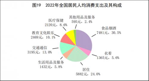 全年全国居民人均消费支出24538元,比上年增长1.8%,扣除价格因素,实际下降0.2%。其中,人均服务性消费支出[54]10590元,比上年下降0.5%,占居民人均消费支出的比重为43.2%。按常住地分,城镇居民人均消费支出30391元,增长0.3%,扣除价格因素,实际下降1.7%;农村居民人均消费支出16632元,增长4.5%,扣除价格因素,实际增长2.5%。全国居民恩格尔系数为30.5%,其中城镇为29.5%,农村为33.0%。