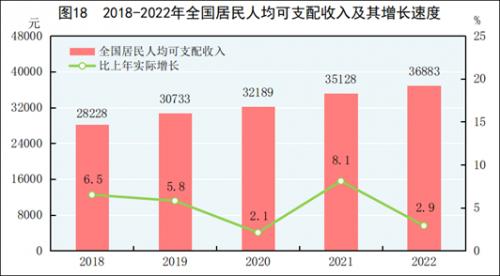 全年全国居民人均可支配收入36883元,比上年增长5.0%,扣除价格因素,实际增长2.9%。全国居民人均可支配收入中位数[51]31370元,增长4.7%。按常住地分,城镇居民人均可支配收入49283元,比上年增长3.9%,扣除价格因素,实际增长1.9%。城镇居民人均可支配收入中位数45123元,增长3.7%。农村居民人均可支配收入20133元,比上年增长6.3%,扣除价格因素,实际增长4.2%。农村居民人均可支配收入中位数17734元,增长4.9%。城乡居民人均可支配收入比值为2.45,比上年缩小0.05。按全国居民五等份收入分组[52],低收入组人均可支配收入8601元,中间偏下收入组人均可支配收入19303元,中间收入组人均可支配收入30598元,中间偏上收入组人均可支配收入47397元,高收入组人均可支配收入90116元。全国农民工人均月收入4615元,比上年增长4.1%。全年脱贫县[53]农村居民人均可支配收入15111元,比上年增长7.5%,扣除价格因素,实际增长5.4%。