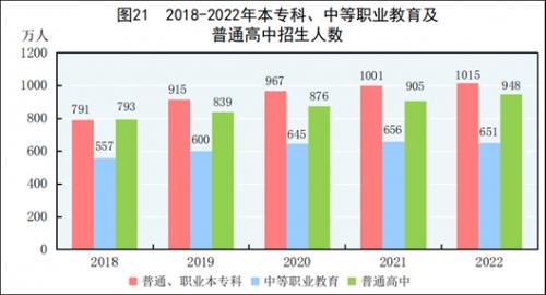 全年研究生教育招生124.2万人,在学研究生365.4万人,毕业生86.2万人。普通、职业本专科[65]招生1014.5万人,在校生3659.4万人,毕业生967.3万人。中等职业教育[66]招生650.7万人,在校生1784.7万人,毕业生519.2万人。普通高中招生947.5万人,在校生2713.9万人,毕业生824.1万人。初中招生1731.4万人,在校生5120.6万人,毕业生1623.9万人。普通小学招生1701.4万人,在校生10732.0万人,毕业生1740.6万人。特殊教育招生14.6万人,在校生91.9万人,毕业生15.9万人。学前教育在园幼儿4627.5万人。九年义务教育巩固率为95.5%,高中阶段毛入学率为91.6%。