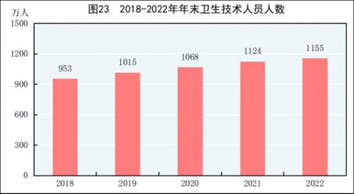年末全国共有医疗卫生机构103.3万个,其中医院3.7万个,在医院中有公立医院1.2万个,民营医院2.5万个;基层医疗卫生机构98.0万个,其中乡镇卫生院3.4万个,社区卫生服务中心(站)3.6万个,门诊部(所)32.1万个,村卫生室58.8万个;专业公共卫生机构1.3万个,其中疾病预防控制中心3385个,卫生监督所(中心)2796个。年末卫生技术人员1155万人,其中执业医师和执业助理医师440万人,注册护士520万人。医疗卫生机构床位975万张,其中医院766万张,乡镇卫生院145万张。全年总诊疗人次[70]84.0亿人次,出院人数[71]2.5亿人。