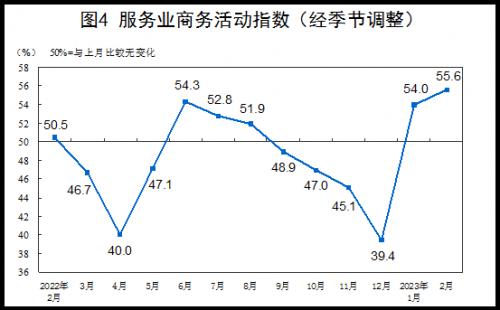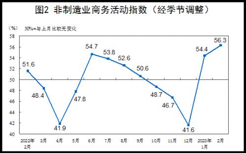 2月份,非制造业商务活动指数为56.3%,比上月上升1.9个百分点,高于临界点,非制造业恢复发展态势向好。