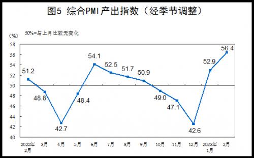 2月份,综合PMI产出指数为56.4%,比上月上升3.5个百分点,高于临界点,表明我国企业生产经营景气水平继续回升。
