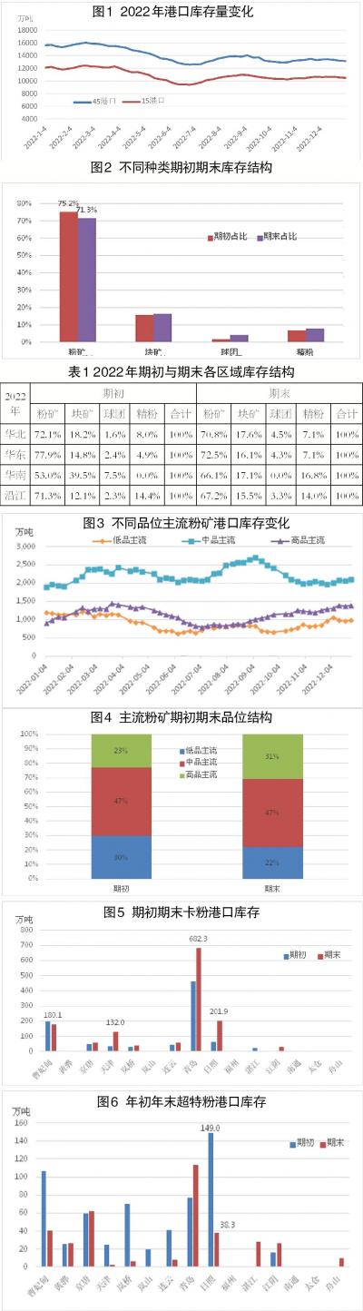 一是从各种类的库存量与结构看,2022年末与年初相比,粉矿库存减量明显,结构占比下降4个百分点。另外,块矿有小幅减量,球团有小幅增量,铁精粉量基本持平,三者的结构占比均有小幅升高。