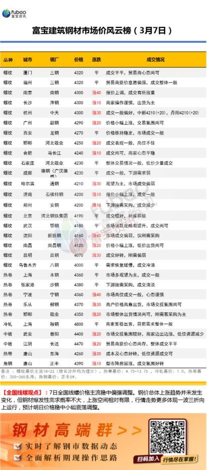 【建材】7日全国线螺价格主流稳中偏强调整。52个样本城市中,上涨城市有18个,占比34.62%,涨幅10-30,保持平稳城市有28个,占比53.85%,下跌城市有6个,占比11.54%,跌20-30。钢价总体上涨趋势并未发生变化,但钢材爆发性需求概率不大,上涨空间相对有限,行情走势更多体现一波三折向上运行,预计今日价格稳中调整。【热卷】7日华东热卷主流价格稳中偏强运行,现货低位回涨,市场情绪好转。上海4360稳,张家港4360稳,莱芜4370涨20,宁波4360涨40,临沂4370涨20。目前市场需求恢复不及预期,多数商家仍维持积极去库为主。新资源的陆续补充使部分商家出现恐高情绪,价格恐上涨动力不足。监管与调控风险不容小觑,发改委打压铁矿石力度不减,铁矿石仍是钢价回落的主要原因。预计短期热卷价格稳中震荡。【带钢】7日全国带钢偏强运行,华北主导钢厂涨30,唐山145系窄带稳后成交顺畅盘中追涨10-30不等,部分厂家可出清日产,中宽现货偏强调整,市场信心有所恢复,贸易商多挺价出货为主,交投氛围尚可,华东华南偏强,高位几无成交。考虑观望情绪浓厚,料今坚挺整理。【型材】7日唐山型钢厂出货量:18家型钢厂出货共39200吨,较上一交易日统计升1650%,成交价角4360槽4330工4330。型价趋弱运行,市场交投氛围活跃,整体成交向好。【管材】7日天津地区涨20-50跌20-80,河北地区涨30-50跌20,北京地区涨30跌20,受盘面反弹影响,焦炭开启提涨,成本端提振情绪,管厂挺价明显,由于北方需求释放相对缓慢,受两会影响交投有所限制,整体交投平平,商家多低价让利促成交,短期心态偏谨慎观望,综合来看,预计今日管市盘整观望为主。四、昨日回顾