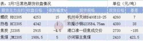一、宏观消息1.成都钢铁网独家解读:与美联储会期对应的互换合约体现9月份达到政策利率峰值5.61%。与美联储政策利率挂钩的掉期价格显示,3月份加息50个基点的可能性更大。据CME“美联储观察”:美联储3月加息25个基点至4.75%-5.00%区间的概率为29.5%,加息50个基点至5.00%-5.25%区间的概率为70.5%;到5月累计加息50个基点的概率为22.1%,累计加息75个基点至5.25%-5.50%区间的概率为60.3%,累计加息100个基点至5.50%-5.75%区间的概率为17.6%。美联储官员在12月曾预测,今年的利率将提高到5.00%和5.25%之间。交易员们现在的定价是,9月份的利率将达到5.64%的峰值。铁水没有继续大幅增加,供给端压力暂缓,需求端除基建品种材以及工业材外并无超预期看点,热卷受查税影响出口订单预计4-5月有所回落,震荡市对待,等待未来两周选择方向。2.【2023全国两会中的钢铁“声音”】政府投资和政策激励要有效带动全社会投资,今年拟安排地方政府专项债券3.8万亿元。加快实施“十四五”重大工程,实施城市更新行动,促进区域优势互补、各展其长,鼓励和吸引更多民间资本参与国家重大工程和补短板项目建设,激发民间投资活力。【中焦协:建议限产30%左右,部分焦企开启提涨100】3月6日,中焦协市场委员会以视频方式召开市场分析会,山西、河北、内蒙古、江苏、河南、山东、陕西、贵州等地主要焦化企业参加了会议。各企业可以根据各自情况延长结焦时间,降低负荷,建议限产30%左右;减少或停止高价煤炭的采购,降低成本。