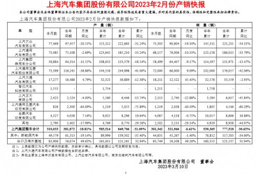 3月9日,上汽集团公告,2月份整车销量301342辆,同比下降6.41%;其中新能源汽车销量44631辆,同比下降1.40%。