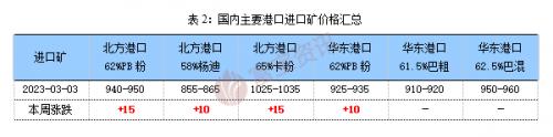 国产矿:本周内粉个强运行,唐山66资源865-885元。限产供需两弱,矿企低价不出,钢企压价询货较难,交投不佳。短期偏强运行。62回转窑球团价格1150-1120元,山西成交1170山东1190元。山东、安徽、邯邢局等大矿3.11日价格预计涨20元左右。