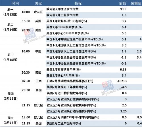 宏观资讯:习近平全票当选中华人民共和国主席、中华人民共和国中央军事委员会主席;国家主席习近平签署主席令,任命李强为中华人民共和国国务院总理;2023年中国发展主要预期目标明确,国内生产总值增长5%左右;国务院机构改革方案出炉,将在银保监会基础上组建国家金融监督管理总局;中国2月CPI同比涨幅大幅回落至1%;PPI同比下降1.4%,基本符合预期;中国2月末M2同比增长12.9%,增速创2016年3月以来新高;前2个月我国进出口总值同比微降0.8%;美国当周初请失业金人数21.1万,为2022年12月以来新高。