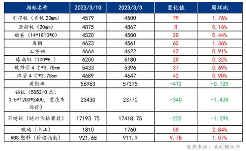 截止2023年3月10日,各原材料当日即时价格以及价格周环比情况如下: