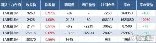 表1:有色金属国内主力合约行情(单位:元/吨)