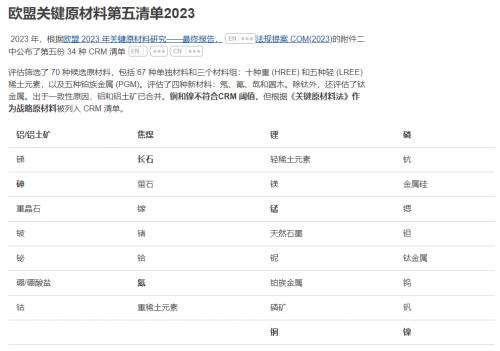 在公布的最新《2023关键原材料清单》中,欧委会提议将铜、镍作为战略原材料列入这份清单。