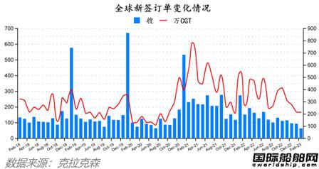 根据克拉克森最新数据统计(截至2023年3月9日),2023年2月份全球新签订单62艘,共计2143061CGT。与2023年1月份全球新签订单92艘,共计2166473CGT相比较,数量环比减少30艘,修正总吨环比下跌1.08%。与2022年2月份全球新签订单151艘,共计2681509CGT相比较,数量同比减少89艘,修正总吨同比下降20.08%。