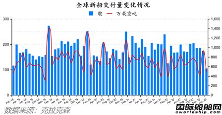 克拉克森数据显示,2023年2月份全球船厂共交付新船105艘,共计5003475载重吨。与2023年1月份全球新船交付订单174艘,共计9385104载重吨相比较,数量环比下跌39.66%,载重吨环比下降46.69%。与2022年2月份全球船厂共交付新船125艘,共计4014473载重吨相比较,数量同比下跌16.00%,载重吨同比上升24.64%。