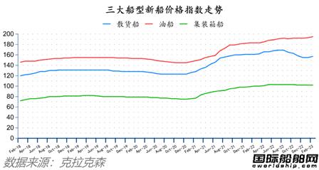 克拉克森数据显示,2月份集装箱船新船价格指数环比持平,为102点;散货船、油船新船价格指数环比均上升2点,分别为157点、195点。