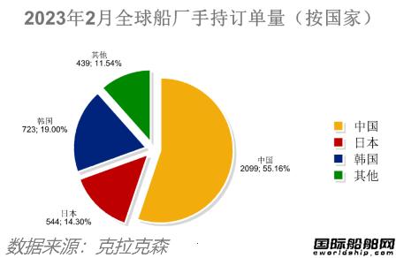按接单船厂国家来看,2月份全球新船订单62艘,合计2143061CGT,其中中国船厂接获12艘,合计206750CGT;日本船厂接获9艘,合计204101CGT;韩国船厂接获34艘,合计1557796CGT。修正总吨分别占全球新船订单量的9.65%、9.52%和72.69%。