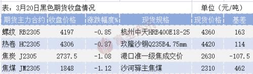 【建材】20日据成都钢铁网统计53个样本城市中,35个城市平稳运行,占比66%,下跌城市12,占比23%,上涨城市6,占比11%,受制于外围风险和双焦下行拖累,钢价高位承压回落,且供需格局有所变化,钢厂生产积极,高供应隐忧未解,相反下游需求迎来回落,整体仍处相对高位,钢市基本面暂无恶化,但利好效应趋弱,短期钢价仍有承压风险,谨防需求持续走弱。预计今日钢价稳中偏弱调整为主。【热卷】3月20日宁波钢铁对热卷出厂价格进行调整,本次调整是以“2月20日宁钢热卷出厂价格调整信息”为基准,具体调整情况如下:4月普碳热卷价格较上期价格上调200元/吨,5.5mmQ235表列出厂价格为4800元/吨,低合金加价120元/吨。以上调整均为含税价,执行日期自2023年4月1日起。【冷轧】20日天津炬坤0.2*(650-1000)*C冷轧基板价格暂稳,报价5500元/吨。20日唐山瑞丰钢铁冷轧、冷硬出厂价格调整:0.8-2.0*(610-635)系列冷硬价格较上一交易日平盘;冷轧较上一交易日平盘,出厂价格分别为4670/4900元/吨。【中板】20日华南10家贸易商中板成交量2150吨左右,较上一交易日下降330吨,下游对高位采购较谨慎,成交刚需为主。【带钢】20日统计唐山5家窄带小厂出货6700吨,降后成交仍弱。限产影响市场供需两弱,下游拿货显观望。【型钢】20日唐山型钢厂出货量:18家型钢厂出货共4820吨,成交价角4350槽4340工4350。型价稳中整理,下游采购积极性不强,成交氛围偏弱。【管材】20日天津友发牌热镀锌价格表、薄壁价格表、燃气价格表下调20元/吨:镀锌管4寸*3.75价格5300元/吨。20日唐山正元管业有限公司出厂价格统一跌30元/吨,正元镀锌管4寸*3.75mm5320元/吨。四、昨日回顾