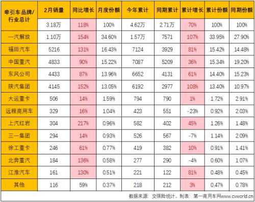 上表可见,与去年2月份相比,牵引车市场主流企业全数实现增长,且同比增幅均达到两位数。其中解放、福田、陕汽、上汽红岩、北奔和江淮等企业增幅破百,同比去年2月份分别增长了154%、131%、152%、217%、136%和130%,市场呈现出一片红的景象。