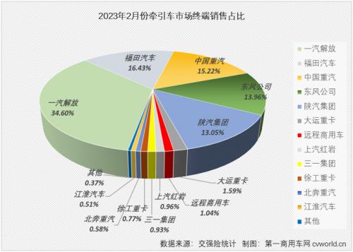 从市场份额看,2月份牵引车终端销量前十企业占据了整个市场98.55%的份额,10名之后的企业仅合计销售不足500辆。其中,排名前首位的解放独食了2月份牵引车终端市场34.60%的份额(较1月份的32.52%还有所扩大),占据了2月份牵引车市场超1/3的份额。排名2-5位的福田、重汽、东风和陕汽2月份份额也均超过10%,分别达到16.43%、15.22%、13.96%和13.05%,排名前五的企业合计份额达到令人咋舌的93.26%(较1月份的90.86%明显扩大),排名5名之后的企业份额均不足2%。2023年仅过了两个月,牵引车行业前五企业已经对后面的追赶部队形成几乎难以逾越的领先优势。