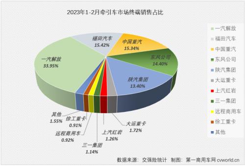 2023年1-2月牵引车终端销量前十排行(单位:辆)