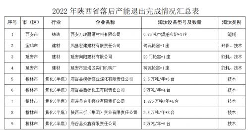 根据《2022年陕西省利用综合标准依法依规推动落后产能退出工作方案》涉及的落后产能退出任务,现将2022年度落后产能退出完成情况予以公示,欢迎社会各界监督。如有异议,请在公示期内及时反馈。公示期:2023年3月23日至2023年3月29日。联系电话:029-63915531029-63916785
