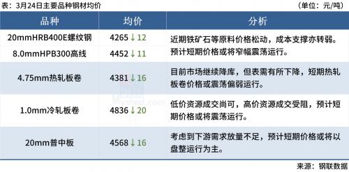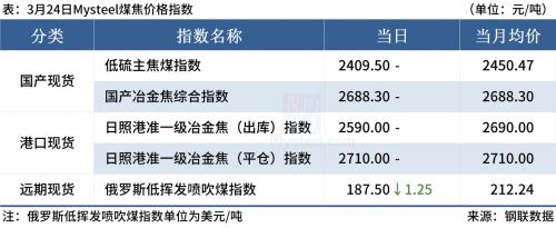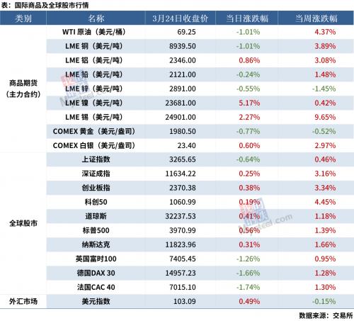 ◎ 3月24日,全国主港铁矿石成交116.30万吨,环比增22.4%;237家主流贸易商建材成交19.41万吨,环比增51.1%。