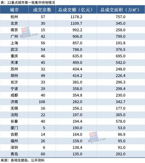 此外,总成交额排名前五的城市还有南京、广州、上海,成交金额分别为992.2亿元、906亿元、857亿元。成交金额较少的城市,如沈阳、长春、厦门、合肥、福州、深圳、青岛,首轮土拍收金均未超过200亿元。原因在于,厦门、深圳、青岛、长春等城市首批供地不及全年住宅用地供应的20%。