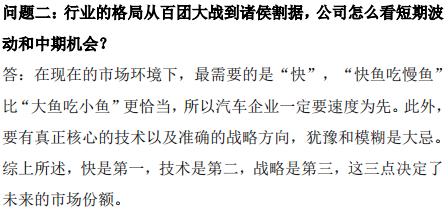 在被问及行业的格局从百团大战到诸侯割据,公司怎么看短期波动和中期机会时,比亚迪方面表示,在现在的市场环境下,最需要的是“快”,“快鱼吃慢鱼”比“大鱼吃小鱼”更恰当,所以汽车企业一定要速度为先。此外,要有真正核心的技术以及准确的战略方向,犹豫和模糊是大忌。综上所述,快是第一,技术是第二,战略是第三,这三点决定了未来的市场份额。