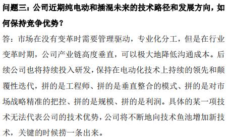在被问及公司近期纯电动和插混未来的技术路径和发展方向,如何保持竞争优势时,比亚迪方面表示,市场在没有变革时需要管理驱动,专业化分工,但是在行业变革时期,公司产业链高度垂直,可以极大地降低沟通成本。后续公司也将持续投入研发,保持在电动化技术上持续的领先和颠覆性迭代,拼的是工程师、拼的是垂直整合的模式、拼的是对市场战略精准的把控、拼的是规模、拼的是利润。具体的某一项技术无法代表公司的技术优势,公司将不断地向技术鱼池增加新技术,关键的时候捞一条出来。