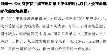 在被问及公司有没有可能在电动车主流化的时代取代大众在油车时代的巅峰位置时,比亚迪方面表示,2022年新能源汽车市场供不应求,但来到2023年产能不足、缺料等情况都大幅改善,会进入淘汰赛。今年1-2月市场总盘子同比减少,但新能源同比增加,而公司贡献其中主要增量,市占率进一步提升。从后续发展的角度来看,在10-20万元的价格带,虽然公司有定价权,但公司也希望平稳一点发展。