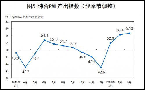 3月份,综合PMI产出指数为57.0%,比上月上升0.6个百分点,位于较高景气区间,表明我国企业生产经营总体情况继续好转。