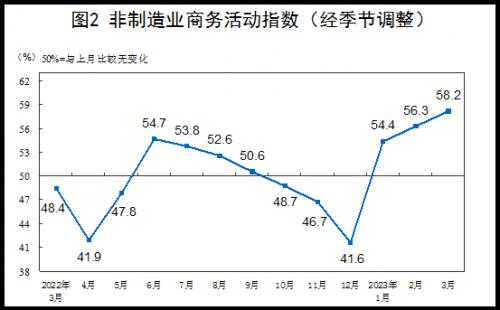 3月份,非制造业商务活动指数为58.2%,比上月上升1.9个百分点,高于临界点,非制造业恢复发展步伐加快。
