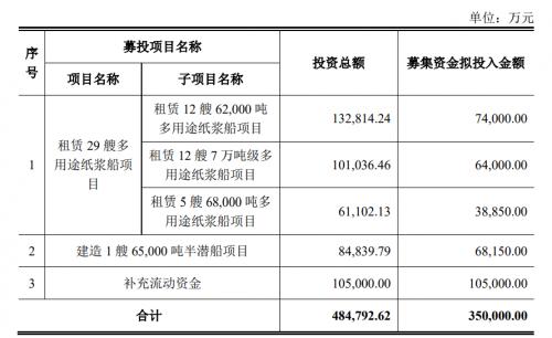 在扣除相关发行费用后的募集资金净额将投资于如下项目:租赁29艘多用途纸浆船项目(包括12艘62000吨、12艘7万吨级和5艘6800吨多用途纸浆船),建造1艘65000吨半潜船项目,以及补充流动资金。