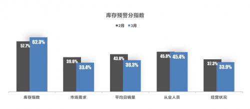 从分指数情况看:3月库存指数环比上升,市场需求、平均日销量、从业人员、经营状况指数环比下降。由于消费者对更高折扣持有观望情绪,部分市场需求被抑制,降价促销也导致经销商利润下滑。