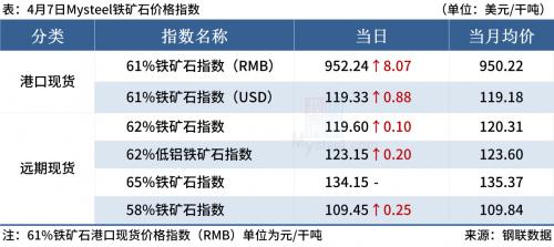 ◎ 4月7日,全国主港铁矿石成交113.90万吨,环比增8.4%;237家主流贸易商建材成交19.52万吨,环比增39.5%。