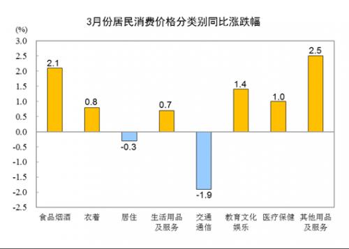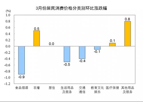 3月份,全国居民消费价格环比下降0.3%。其中,城市下降0.3%,农村下降0.3%;食品价格下降1.4%,非食品价格持平;消费品价格下降0.5%,服务价格上涨0.1%。