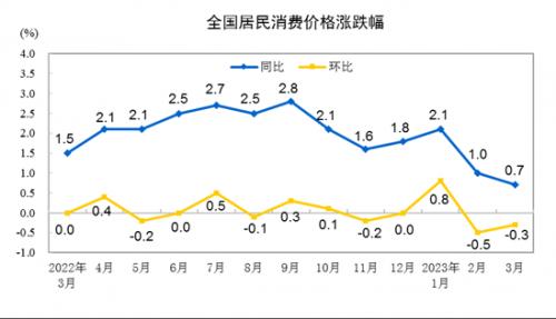 2023年3月份,全国居民消费价格同比上涨0.7%。其中,城市上涨0.7%,农村上涨0.6%;食品价格上涨2.4%,非食品价格上涨0.3%;消费品价格上涨0.5%,服务价格上涨0.8%。1—3月平均,全国居民消费价格比上年同期上涨1.3%。