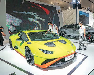 在第三届中国国际消费品博览会现场,观众正在参观展车。