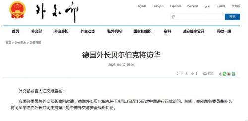 应国务委员兼外交部长秦刚邀请,德国外长贝尔伯克将于4月13日至15日对中国进行正式访问。其间,秦刚国务委员兼外长将同贝尔伯克外长共同主持第六轮中德外交与安全战略对话。