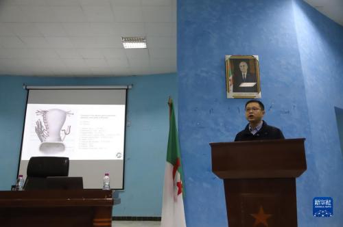 3月7日,在阿尔及利亚塞提夫妇幼医院,中国援阿医疗队医生朱涛为当地住院医师、医学院学生等做讲座。新华社发(中国援阿医疗队供图)