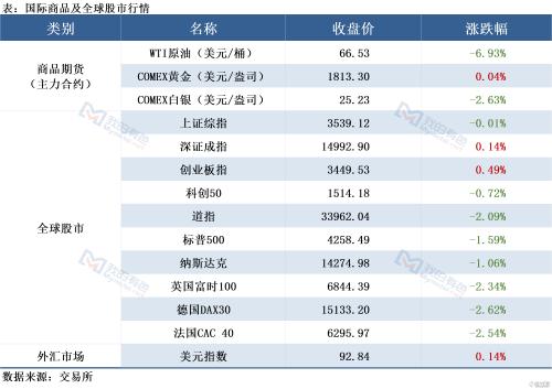 ◎美国三大股指全线大跌,道指创近9个月来最大跌幅。道指跌2.09%报33962.04点,标普500指数跌1.59%报4258.49点,纳指跌1.06%报14274.98点。