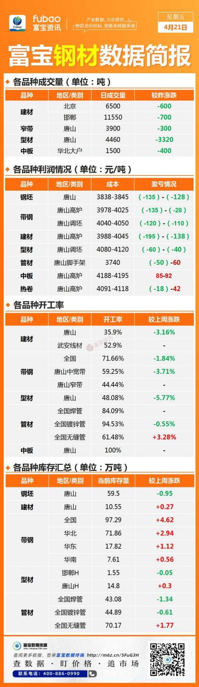 二、产业行情最新消息1.废钢:一季度国内经济数据出炉,GDP同比增长4.5%,超出市场预期,但房地产新开工数据仍然低迷,期货市场冲高回落。临近五一假期,钢厂存补货预期,但钢企普遍利润不佳,部分电炉持续减产,废钢需求难以释放。综合来看短期行情多弱势下跌运行,持续回暖或尚需时间。2.钢坯:22日唐山钢坯跌80报3580元/吨,目前唐山本地及周边部分钢厂普碳方坯报3580元/吨。秦皇岛卢龙钢厂普碳方坯跌80报3580元/吨均含税出厂。受周五黑色系期螺夜盘持绿下挫影响,贸易商操作心态显悲观,加上周六市场行情较弱,整体交投氛围冷清。河北代表钢厂通知从4月23日零点开始焦炭(干焦和湿焦)价格下调100元/吨,成本端支撑转弱,故预计短期钢坯价格稳中偏弱整理。三、钢市动态【建材】22日唐山钢坯报3580元/吨持跌80,昨日钢厂方面,长江跌50,石横永锋稳;华北地区:东华、春兴跌30,邯郸市场跌70-80,安丰跌50;唐山6.5/8-12安丰:3850跌50。华东地区,福州三钢跌70,南钢出厂价跌60,昨天华北地区价格下调明显,市场信心受到影响,预计整体价格短期偏弱运行。【热轧】昨华北热卷价格弱势运行,唐山4000跌80,邯郸4020跌40,价格持续下跌,市场心态恐慌,商户观望为主,周末需求廖廖,预计短期热卷价格震荡偏弱运行。【冷轧】昨华南冷轧市场偏弱运行,乐从柳钢4630元。周五夜盘震荡走低,现货市场氛围不佳,多让利出货为主,考虑下游需求观望,预计今市场弱稳盘整。【中板】昨华北中板主流偏弱,其中唐山4200~4270较昨降30~80,钢厂指导价4270,主流贸易商现货规格不全,规格加价不等,各家灵活出货,武安部分出价4250较昨跌10,盘面整体下移,市场信心不足,操作上让价走货为主,料短期低靠调整。【带钢】昨唐山145系窄带主流累降70-90报3820-3850含税出厂,仅低位资源有成交,但多数表现偏差;285-355系市场裸价现货3510-3540(主流3525)宏兴3530,现货较前天午后收盘价降70左右。贸易商砸价出货意愿增强,情绪表现偏空。料今行情弱势,交投暂谨慎观望。【型钢】昨唐山型材全面下跌。角5-6.3#3970;槽8-16#3970;工14-20#4000。虽值传统旺季,但需求弱势格局未有改观,贸易商采购均较谨慎,对后市观望态度明显,且成本端支撑弱势,预计今型价将主流下探运行。【管材】昨日管材唐山主流价格宽幅下调,下调幅度40-80,价格下行期,市场谨慎心疼浓厚,贸易商采货积极性较差,管厂多有适量减产,综合考虑,预计今管材价格偏弱调整。四、上周回顾
