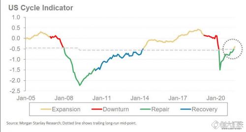 这轮周期,2019年6月进入周期后期的“衰退”,2020年4月进入周期初期的“修复”,之后股价一路飙升。它上升得如此之快,以至于它很快就跳过了“复苏”阶段,进入了“扩张”阶段。