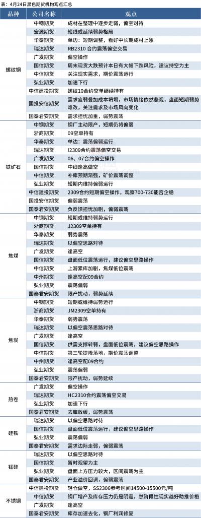 据Mysteel统计4月24日12家期货机构操作策略,其中多数机构看空螺纹钢,建议铁矿石震荡偏弱,焦煤、焦炭震荡偏弱。具体汇总内容如下: