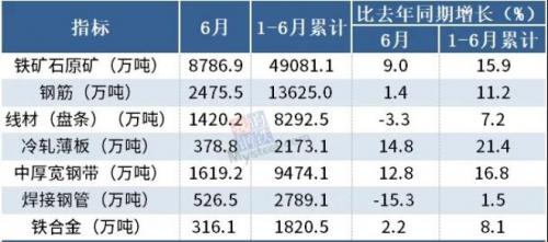 6月份,我国铁矿石原矿产量为8786.9万吨,同比增长9.0%;1月~6月份累计产量为49081.1万吨,同比增长15.9%。