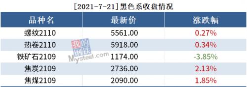 截至7月21日收盘,螺纹2110收5561,涨0.27%;热卷2110收5918,涨0.34%;铁矿石2109收1174,跌3.85%。
