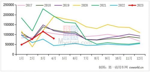 2017-2023年我国重卡市场销量月度走势图(单位:辆)